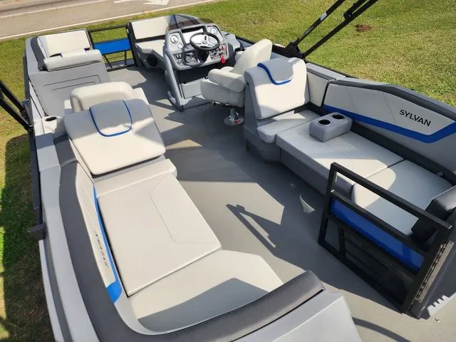 The Sylvan A-Series 822 LZ DH Sport is a stunning pontoon boat designed for both comfort and style. Featuring side-by-side dual helm chairs, it offers a perfect blend of luxury and functionality for the captain and co-captain. The full sea weave flooring enhances durability while providing a sleek, modern aesthetic. Equipped with robust 23" diameter tubes and Sylvan's innovative PTS tube system, along with rotocast molded corners that seamlessly integrate into the side panels, this boat boasts a streamlined appearance that stands out on the water. Additionally, the included bimini top ensures sun protection, making it an ideal choice for leisurely days out on the lake.