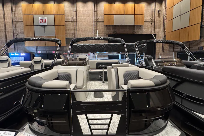 2026 Sylvan L-3 DLZ BAR is a fully loaded tritoon built for performance, comfort, and premium style. Finished in Metallic Black painted panels with chrome Sylvan graphics, this boat features the Platinum Package, which adds fiberglass fence panels, a black see-through front gate, upgraded windscreen with black brackets, a helm platform with custom SeaDek, center tube in-floor storage with SeaDek mat, and the Lillipad REVO ladder. The interior is trimmed in grey upholstery with Downpour Sea Weave flooring, delivering a clean, modern look that's both durable and upscale.