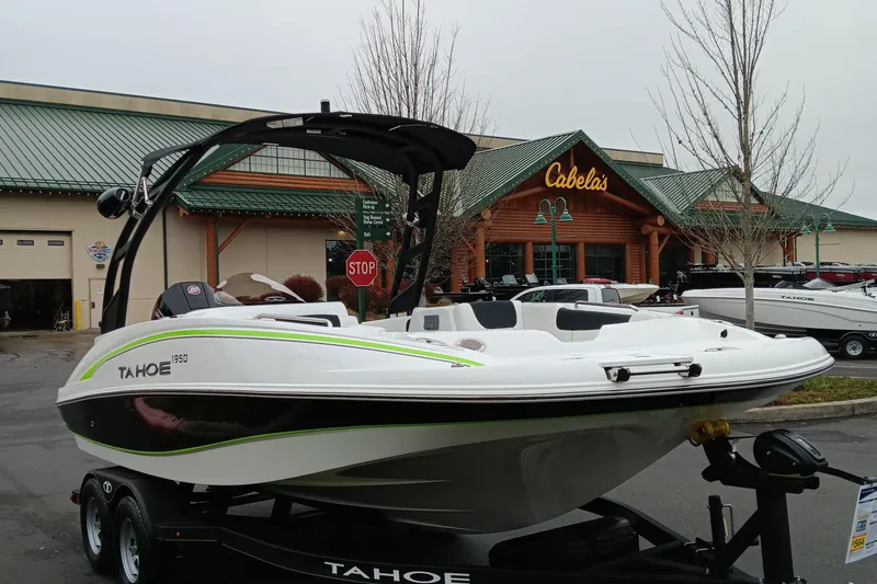The TAHOE® 1950 deck boat lets you experience summer the right way-on the water with family and friends in bountiful luxury with exhilarating performance. Let your crew spread out on the ample lounges and benches, conveniently stowing all manner of gear throughout. At the helm you'll find simple, reliable switching and gauges that keep you in the know at all times. A 36-qt. removable cooler keep things icy cold but when it's time to fire it up, stout outboard power is a shove of the throttle away. Options added to this boat are: Kicker premium tower speaker upgrade; w/3.5"(8.89cm) LCD Display; 10" (25.4 cm) subwoofer & subwoofer amplifier; two additional tower speakers; & dash-& aft mounted remotes: bow filler cushion: water tank ,sink, and sprayer: Removable snap-in vinyl flooring: Folding wakeboard tower and two wakeboard racks w/black tectured, powder coated aliminum frame & Black Bimini Top (factory installed) Trailerable ratchet mooring cover- color matched to hull Gelcoat. Custom fit tandem axle trailer w/Galveshield Impact corrosion protection, brakes on both axles & spare tire. Includes foldaway tongue jack