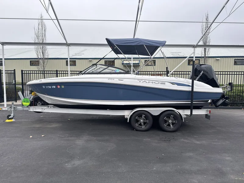 , The 2022 Tahoe 210 S is a stylish and spacious 21-foot bowrider designed for a mix of leisure and performance on the water. Powered by a 200HP Mercury outboard engine, this boat is ideal for watersports, cruising, and entertaining. It features a spacious cockpit with seating for up to 10 passengers, ample storage including in-floor wakeboard storage, and a swim platform with a 4-step ladder for easy boarding. The boat's construction includes a stable POWERGLIDE® hull and advanced design features for a smooth ride. With a fuel capacity of 45 gallons, it ensures longer trips without frequent refueling stops, while its sleek, modern styling and sound system elevate the boating experience.