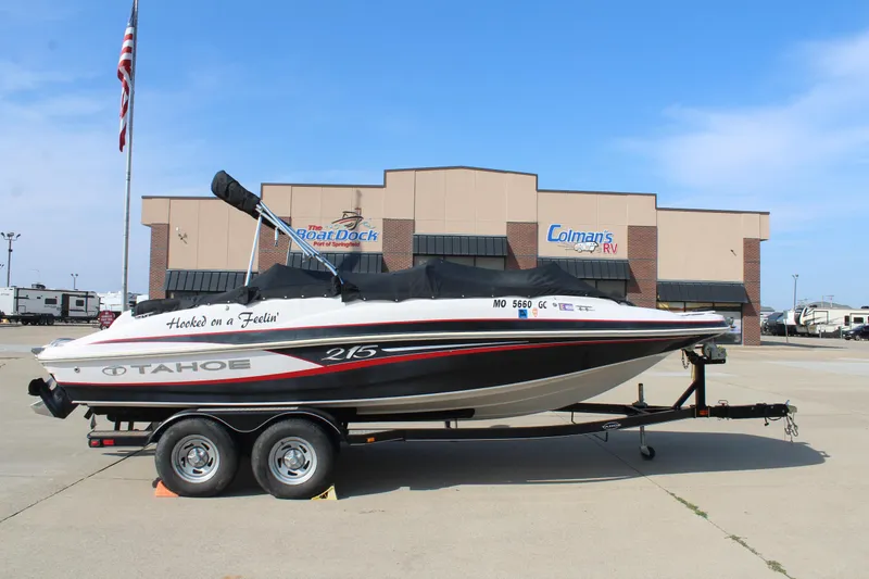 The 2015 Tahoe 215 I/O is a stylish 21-foot boat perfect for family fun and recreation. With a powerful inboard/outboard engine, it balances performance and efficiency for cruising and watersports. The sleek hull ensures stability and handling in various water conditions. The spacious cockpit offers comfortable seating and easy access to the water, along with ample storage for gear and coolers. Onboard features include a bimini top for sun protection, a swim platform, and a sound system. Designed with safety in mind, the Tahoe 215 I/O is ideal for day trips and longer outings.