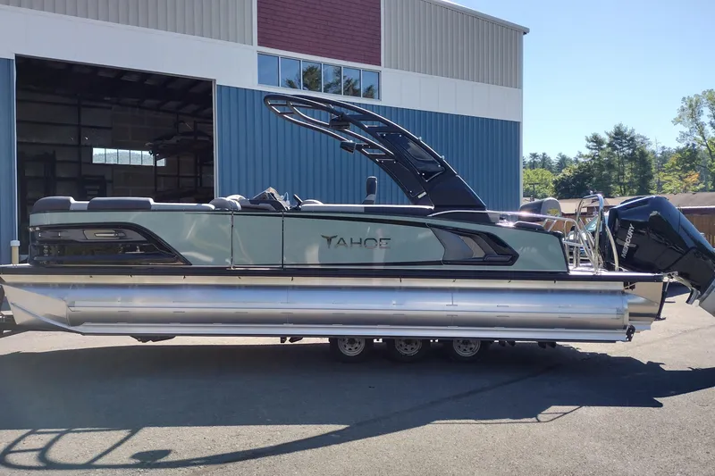 Standard Features Include; 17 Person/ 2460 lb Capacity, Saltwater Package, Waveglider Triple 27" Pontoons w/ High Performance Lifting Fins & Side Keels, Full Mooring Cover, Bimini Top, Ski Tow Bar, High Back Reclining Driver's Chair on Raised Helm, Blue Ice Interior Light Package, Blue Under Rubrail Lights, Large Rectangle Graywood Heavy Duty Thermoform Table, USB Charging Ports, Dual Batteries, Blue Exterior EGT Docklights, Blue Rubrail Lights, Rear Underwater Lights, Quick Release Fender Holders w/ Straps, In Floor Ski Storage Locker, Stainless Steel Prop, Tilt Out Trash