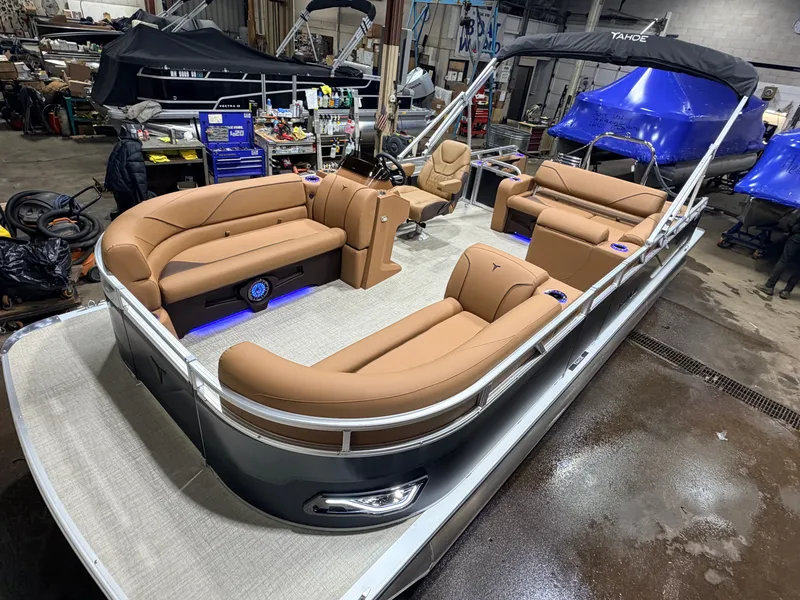 2026 Tahoe Sport 2385 Versatile Rear Bench (VRB) Swingback Tritoon Pontoon & Honda 4-Stroke EFI. This 23' Tri-Toon Platinum Edition Pontoon Has Front Chaise Lounge Seating With Storage, Wrap Around Chaise Lounge Seating With Storage, Seating That Turns Into A Bed Or Rear Facing Bench Seating, Sport Platinum Edition (Commander Reclining Captain's Chair, Garmin 52CV, LED Smoked Chrome Docklights, Polished Corner Caps, Platinum Edition Special Badging), Ski Tow Bar w/Chains, Rear Swim Deck, Riptide Vinyl Flooring, Table, Mooring Cover, Blue Ice Package (Lighted Cup Holders, Speakers & Mood Lighting), Fusion Bluetooth Radio, Multiple Cup Holders, 25" Tubes,10' Bimini Top, Polished Corner Caps, Gated Aft, Cognac Interior Package, Bow & Aft USB Charging Ports, Sport Performance Package, Built-In 38 Gallon Gas Tank, Hydraulic Steering, Lifting Strakes, Aluminum Undersheeting, Ladder, On/Off Battery Switch, Built-In Trash Can, Side Storage Behind Captain's Seat, Front Deck. Rated For 12 People. Honda 115HP 4-Stroke EFI - $47,995 Honda 140HP 4-Stroke EFI - $49,495 Honda 150HP 4-Stroke EFI - $50,995 Honda 200HP 4-Stroke EFI - $54,995 Don't Be Fooled With Additional Fees @ Closing. Our Price, Plus Tax & License, Includes Freight, Rigging, Battery, Prop, Etc.... Trailer Is Not Included But Available For Use Or Purchase. 5 Year Warranty With Honda 10 Year Warranty With Tahoe Financing Available OAC All Factory Rebates For Boat And Motor Included In Price Call Boat World @ 763.434.9655 Stock #7960 To Learn More And See More New Pontoons Visit Us @ www.boatworldmn.com Tahoe Pontoons are built by Avalon and Tahoe Manufacturing in Alma Michigan