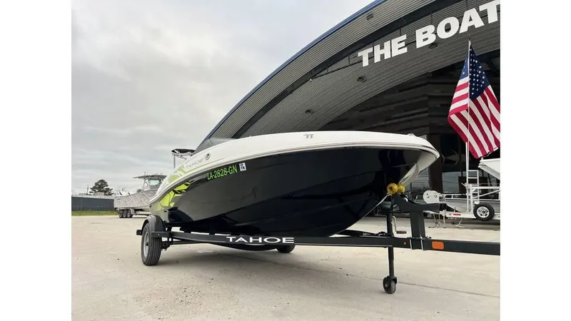 Featuring all-new composite construction, this TAHOE® is ready for a lifetime of fun and adventure. The T16 comes standard with an automatic bilge pump and a depthfinder that add capability to the spirited performance. Twin bow lounges open to reveal storages and the aft features a wide lounge that matches the cockpit bench seating with flip-open driver and passenger seats. Rounding out this package is a standard trailer and 60-horsepower Mercury® FourStroke for economical and reliable performance.