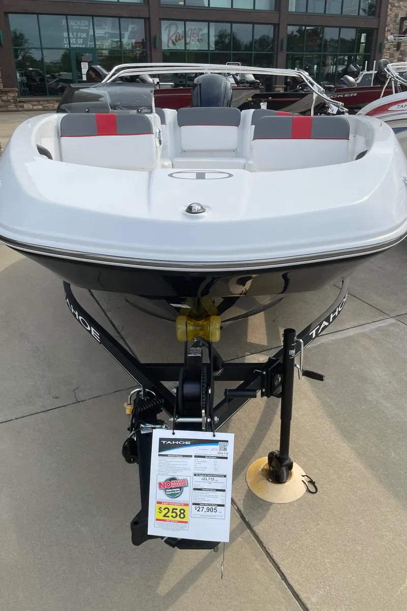 The TAHOE® T16 is fully loaded and priced to deliver huge returns of fun and excitement. A 7" touchscreen multifunction display is standard and displays your GPS-accurate speed, the water depth, as well as your motor's vitals. Inside, creature comforts abound in the form of twin forward lounges with ample underseat storage, and out back you'll find a sun pad and a FourStroke Mercury outboard for spirited and economical performance. Rounding out the package is a custom-built trailer for years of on-road peace of mind.