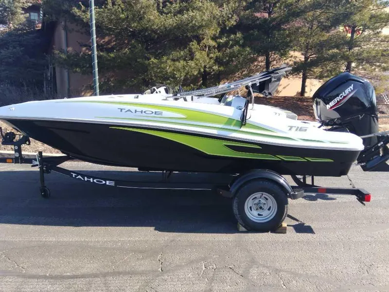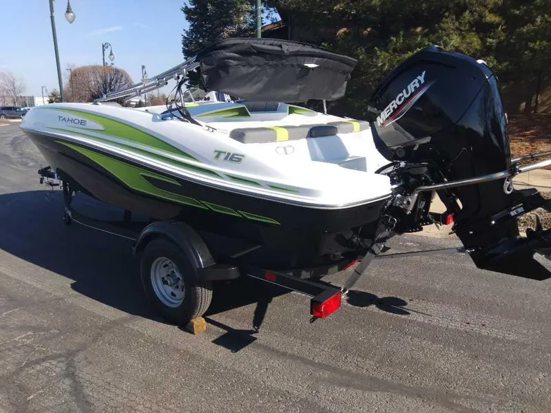 The TAHOE® T16 is fully loaded and priced to deliver huge returns of fun and excitement. A 7" touchscreen multifunction display is standard and displays your GPS-accurate speed, the water depth, as well as your motor's vitals. Inside, creature comforts abound in the form of twin forward lounges with ample underseat storage, and out back you'll find a sun pad and a FourStroke Mercury outboard for spirited and economical performance. Rounding out the package is a custom-built trailer for years of on-road peace of mind.