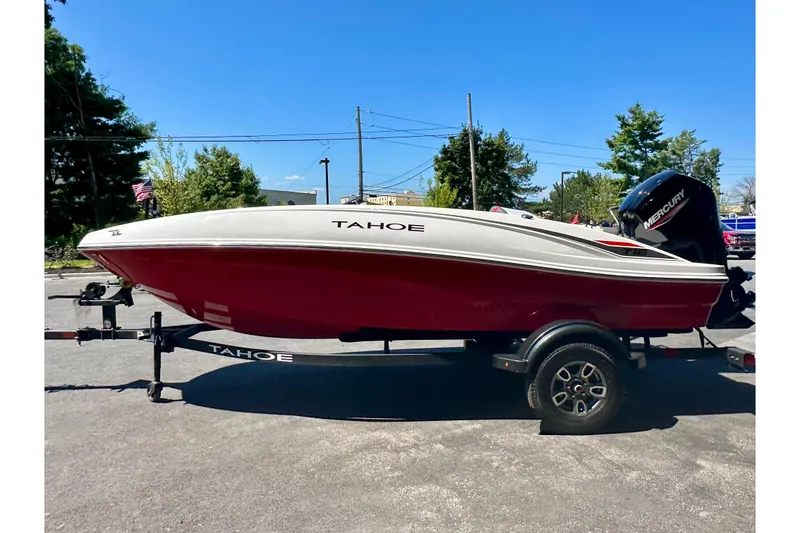 The 2025 TAHOE® T16 comes standard with a 60hp Mercury® ELPT FourStroke outboard motor and has a recommended maximum 75hp rating. This model is packaged with a trailer.