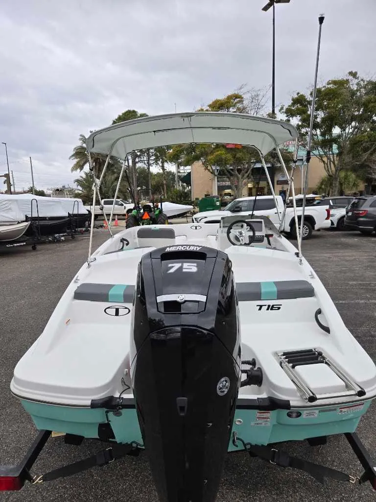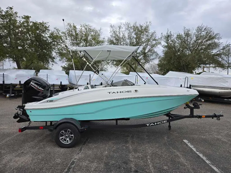 The 2025 TAHOE® T16 comes standard with a 60hp Mercury® ELPT FourStroke outboard motor and has a recommended maximum 75hp rating. This model is packaged with a trailer.