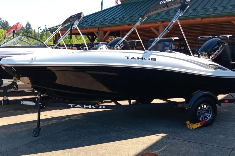 The 2025 TAHOE® T16 comes standard with a 60hp Mercury® ELPT FourStroke outboard motor and has a recommended maximum 75hp rating. This model is packaged with a trailer.