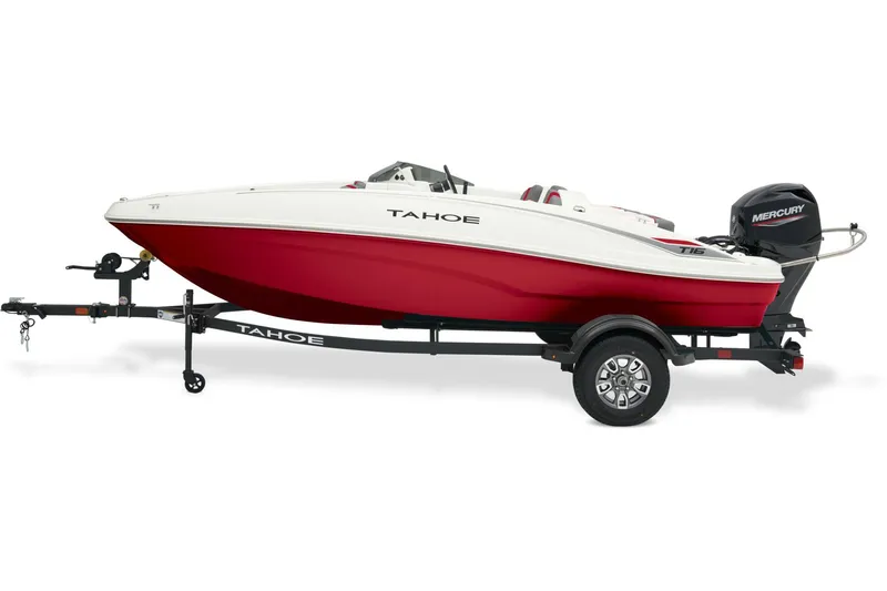 The 2025 TAHOE® T16 comes standard with a 60hp Mercury® ELPT FourStroke outboard motor and has a recommended maximum 75hp rating. This model is packaged with a trailer.