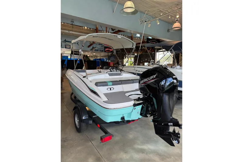 The 2026 TAHOE® T16 comes standard with a 60hp Mercury® ELPT FourStroke outboard motor and has a recommended maximum 75hp rating. This model is packaged with a trailer.