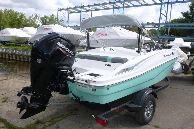 Shop the 2026 Tahoe T16 sport boat with Mercury 75HP, hydraulic steering, trailer, cover, and TurboSwing. Available now at Grand Pointe Marina in Michigan.