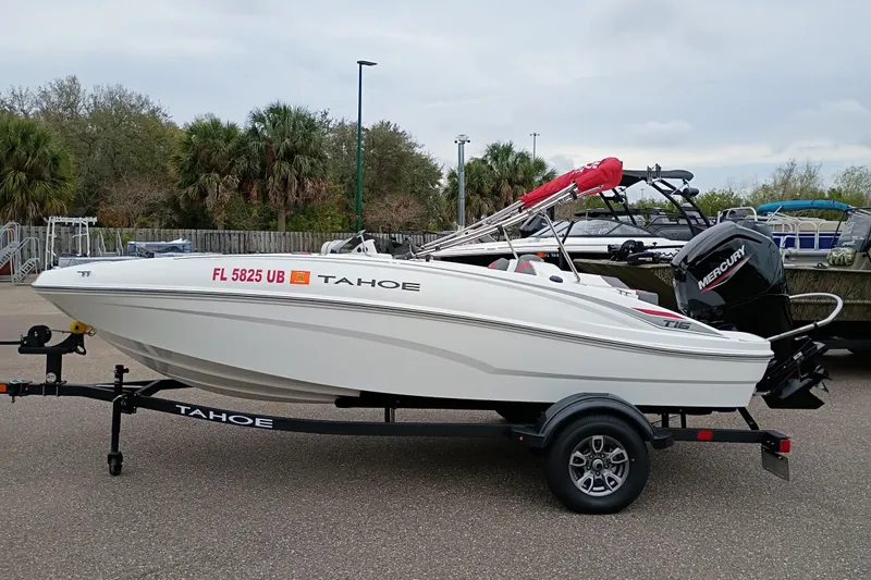 The 2026 TAHOE® T16 comes standard with a 60hp Mercury® ELPT FourStroke outboard motor and has a recommended maximum 75hp rating. This model is packaged with a trailer.