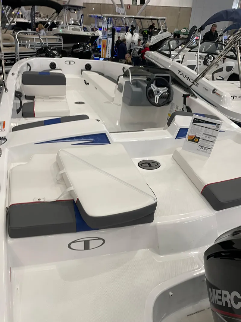 This Tahoe T18 includes red white and blue graphics, under seat storage, a ratchet mooring cover, trim gauge, fuel gauge, fire extinguisher, paddle, swimming ladder, sun pad and only 20 hours on the engine!