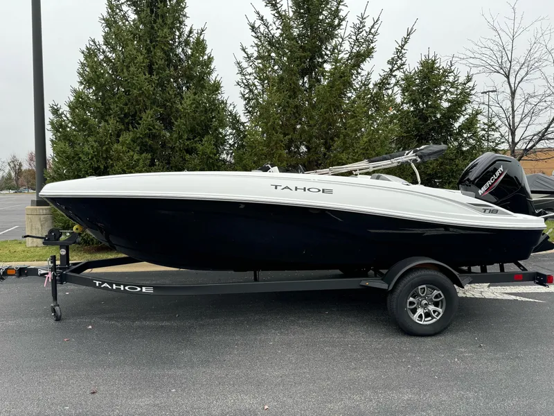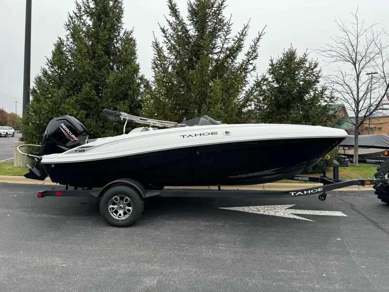 The 2025 TAHOE® T18 comes standard with a 90hp Mercury® ELPT FourStroke outboard motor and has a recommended maximum 115hp rating. This model is packaged with a trailer.