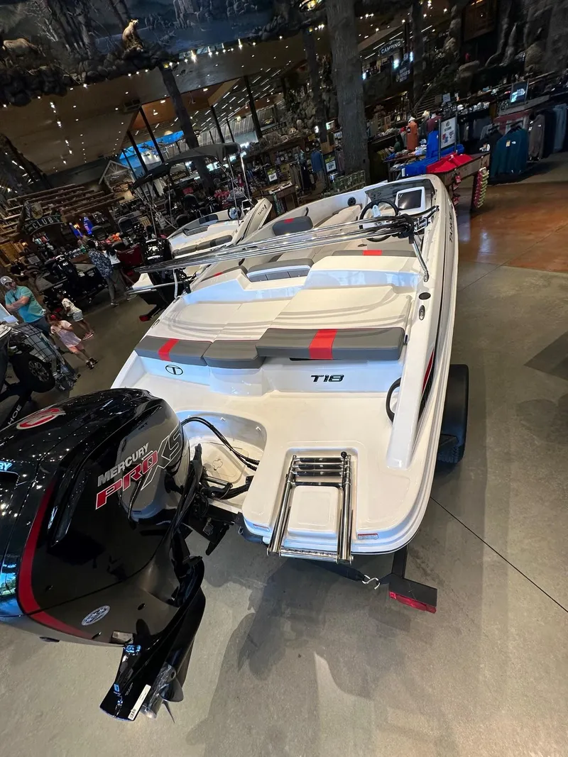The 2025 TAHOE® T18 comes standard with a 90hp Mercury® ELPT FourStroke outboard motor and has a recommended maximum 115hp rating. This model is packaged with a trailer.