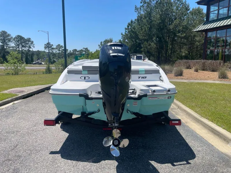 The 2025 TAHOE® T18 comes standard with a 90hp Mercury® ELPT FourStroke outboard motor and has a recommended maximum 115hp rating. This model is packaged with a trailer.