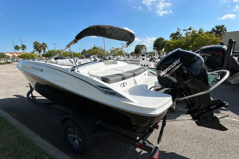 The 2026 TAHOE® T18 comes standard with a 90hp Mercury® ELPT FourStroke outboard motor and has a recommended maximum 115hp rating. This model is packaged with a trailer.