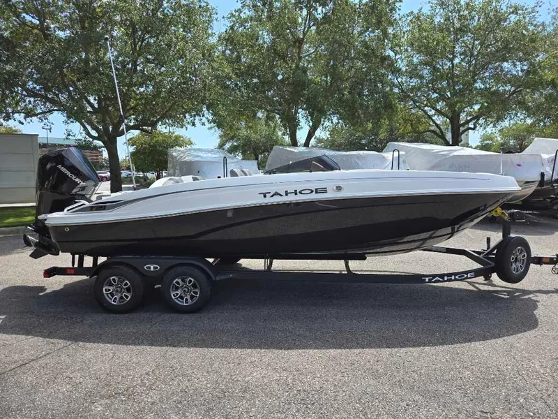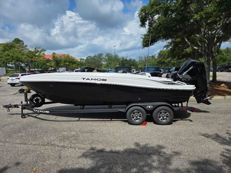 The 2025 TAHOE® T21 comes standard with a 150hp Mercury® XL Pro XS® FourStroke outboard motor and has a recommended maximum 200hp rating. This model is packaged with a trailer.