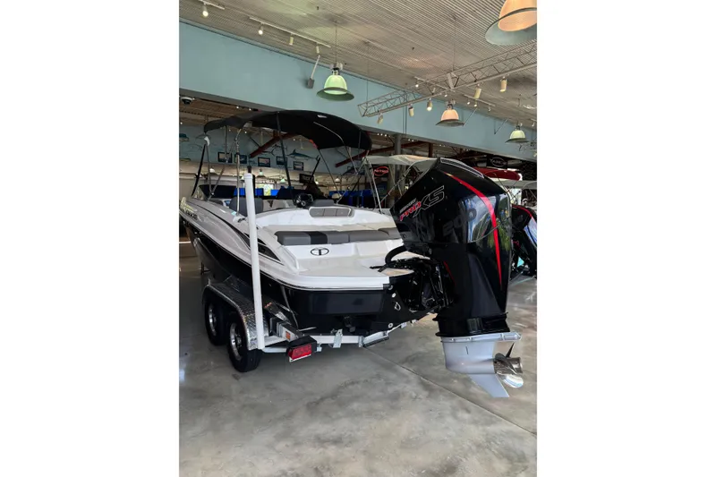 The 2025 TAHOE® T21 comes standard with a 150hp Mercury® XL Pro XS® FourStroke outboard motor and has a recommended maximum 200hp rating. This model is packaged with a trailer.