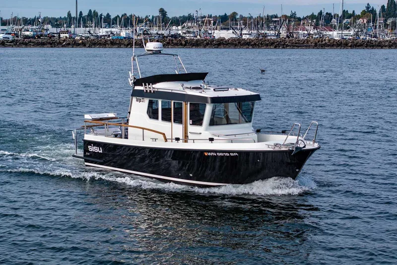 This particular Targa 27.2 is well-outfitted for Northwest fishing and year-round use, featuring a powerful Volvo Penta D6-370 engine, dual-station Garmin navigation suite with radar and transducer, and a flybridge equipped for excellent visibility and control. The Jet-Black hull and two-tone deck styling give it a commanding, modern look, while high-quality teak and stainless details reflect Targa's enduring craftsmanship.