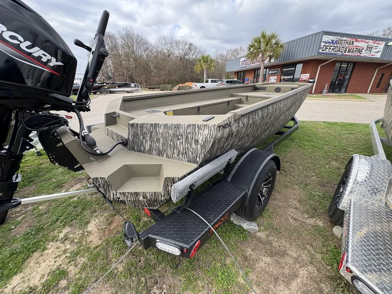 The new THOR Timber Hammer 1754 packs all of the great features of the original LH1754 with one major addition: THOR's exclusive Lightning Rail Keel. This proprietary keel extrusion not only adds tremendous strength and durability to the already legendary Anvil Hull design, but it also makes the TH1754 the most nimble tiller boat in the Lake Hammer Series lineup. Perfect for dodging trees or running twisting trails through the cattails. The new TH1754 - The toughest, most agile Hammer in the swamp.Powered by a Mercury 60ELHPTMarine Master TrailerBase.125 Gauge Anvil HullLightning Rail Keel ExtrusionHammer Head Bow Cap Receiver w/Thor insert and locking pinDeluxe Transom StepsRaptor LinerMossy Oak Bottomland or Thor Rapture Camo(2) Aft Storage Boxes/Seats(3) Black, textured seat basesAft switch plate w/ dual USB chargerBilge Pump6 Gallon Fuel Tank w/ Tie Down(1) Group 27 Battery TrayBlue Seas On/Off Switch and Circuit BreakersSpare Wiring ChaseIntegrated Bow Cup HolderDual T-Rail Gunnel SystemDeluxeIncludes all Standard Features Plus:Deluxe Integrated Bow LightsRear Switch Panel w/dual USB ChargerForward switch panel w/ dual USB ChargerTrolling Motor Wiring PackageWaterproof Liner Mats in all Storage Boxes(2) Group 27 Battery BoxesAdditional Specifications:Length 17 FeetWidth 54 InchesBeam 72 InchesFreeboard 24 InchesSide 26 InchesWeight 722 pounds prior to riggingHorsepower Rating: 60 HPPassenger Rating: Approximately 4 People