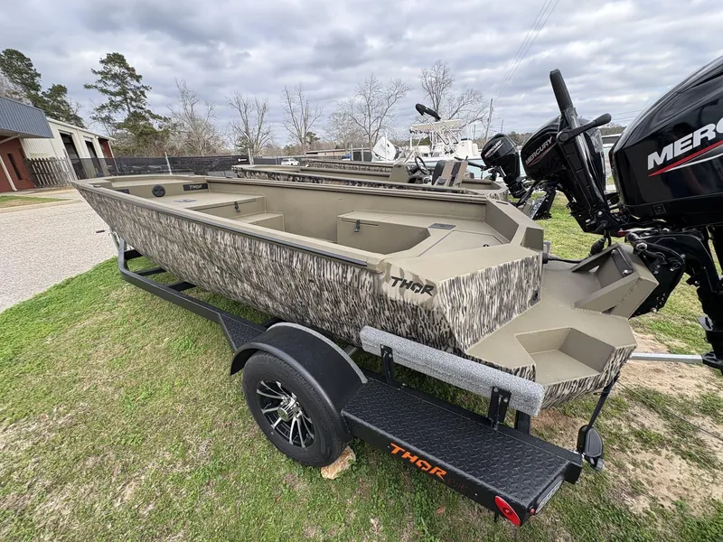 The new THOR Timber Hammer 1754 packs all of the great features of the original LH1754 with one major addition: THOR's exclusive Lightning Rail Keel. This proprietary keel extrusion not only adds tremendous strength and durability to the already legendary Anvil Hull design, but it also makes the TH1754 the most nimble tiller boat in the Lake Hammer Series lineup. Perfect for dodging trees or running twisting trails through the cattails. The new TH1754 - The toughest, most agile Hammer in the swamp.Powered by a Mercury 60ELHPTMarine Master TrailerBase.125 Gauge Anvil HullLightning Rail Keel ExtrusionHammer Head Bow Cap Receiver w/Thor insert and locking pinDeluxe Transom StepsRaptor LinerMossy Oak Bottomland or Thor Rapture Camo(2) Aft Storage Boxes/Seats(3) Black, textured seat basesAft switch plate w/ dual USB chargerBilge Pump6 Gallon Fuel Tank w/ Tie Down(1) Group 27 Battery TrayBlue Seas On/Off Switch and Circuit BreakersSpare Wiring ChaseIntegrated Bow Cup HolderDual T-Rail Gunnel SystemDeluxeIncludes all Standard Features Plus:Deluxe Integrated Bow LightsRear Switch Panel w/dual USB ChargerForward switch panel w/ dual USB ChargerTrolling Motor Wiring PackageWaterproof Liner Mats in all Storage Boxes(2) Group 27 Battery BoxesAdditional Specifications:Length 17 FeetWidth 54 InchesBeam 72 InchesFreeboard 24 InchesSide 26 InchesWeight 722 pounds prior to riggingHorsepower Rating: 60 HPPassenger Rating: Approximately 4 People