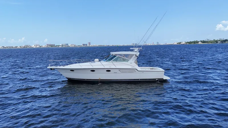 This 2000 Tiara Yachts 3700 is a well-maintained, turnkey sportfishing and cruising vessel powered by Cummins 6CTA-8.3 Diamond Series engines with 300 hours since overhaul by Saunders Yachtworks and a 2024 Westerbeke 9kW generator with only 300 Hours. It features upgraded electronics including Dual Raymarine Axiom Pro12 RVX, Autopilot, FLIR thermal camera, and Fusion stereo. The cockpit is fully outfitted for fishing with rigged Rupp outriggers, a rocket launcher fighting chair, tackle storage, a livewell, and a 5' fishbox. Below deck, the interior includes a queen master berth, private head access, convertible L-shaped settee, and a full galley with modern appliances. Comfort upgrades include three climate control zones, Vacuuflush head, adjustable helm seating, and a fold-away transom seat. This Tiara 3700 offers the ideal mix of performance, functionality, and luxury for both serious anglers and cruising enthusiasts and has been kept to utmost perfection stored in Covered Storage!