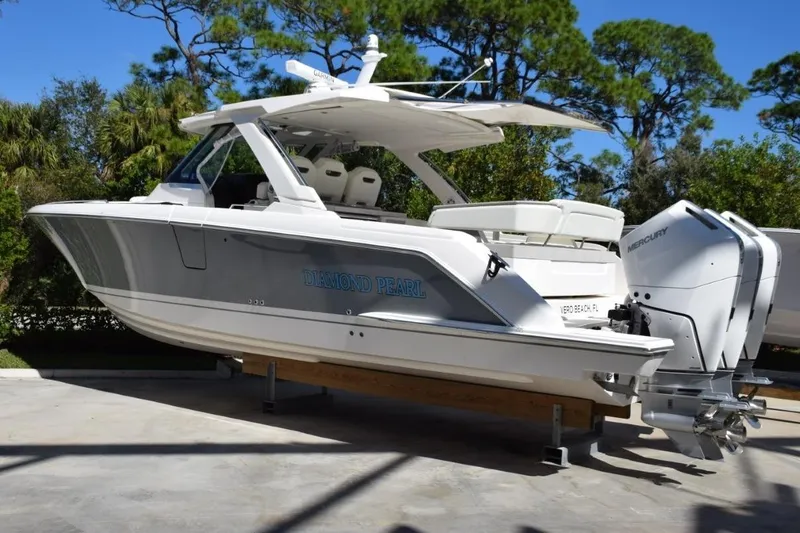 A 2024 model with BMW Brooklyn Grey Hull with white boot stripe and no bottom paint. DIAMOND PEARL has the preferred V10 400hp Mercury engines (cold fusion white) Joystick Piloting Option (includes skyhook). There is also an Onan 5kW generator/Cummins diesel with helm air and a SeaKeeper SK3 gyrostabilizer. A very sharp looking boat that has seen minimal usage, 49 hours. Ceramic coated in 2024 and recently detailed.