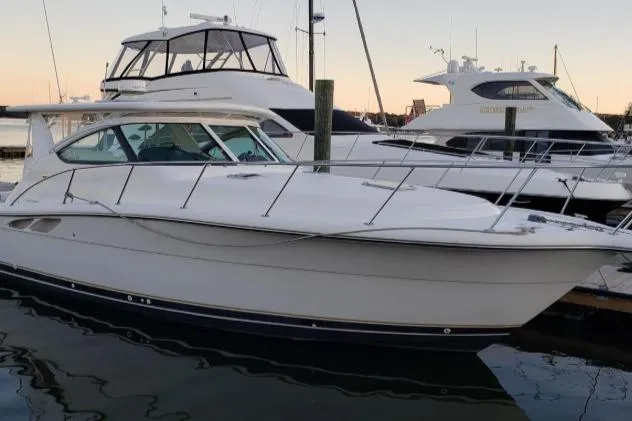 With over six feet, seven inches of headroom, three opening foredeck hatches and six hullside portlights (with screens), the Tiara 3800 Open interior is large and well-lit. The starboard U-shaped lounge converts to an over-sized dinette with a hi-lo pedestal table or to a double berth. The lounge backrest flips up to make a pullman-style single berth. The AM / FM stereo is standard. The fully-equipped galley features a double bowl stainless sink, microwave oven, two-burner electric cooktop, AC / DC refrigerator / freezer, Corian countertop, lazy susan under the counter shelf unit, and plenty of over / under storage. The completely private owner's stateroom features a pedestal queen berth with storage below, accessed with the aid of a gas-assist lift. A large hanging locker, hullside convenience shelves, and private access to the head complete this retreat. The head has dual access from both the salon and owner's stateroom and offers a separate stall shower and molded Corian countertop and sink with vanity, mirror and storage above, and under-storage below. On deck, standard cockpit seating features an extra-wide back-to-back helm seat with wetbar and storage, and a curved companion lounge with cooler storage and aft-facing seat. An optional fold down transom lounge and ice maker are also available. The stepped cockpit features 147 square feet of entertaining or fishing space. Under the cockpit sole are large compartments for either cruising or fishing stowage, or both. Engines access is through an upper cockpit drop-down hatch, or through a lower cockpit electric hatch lift. Borrowing from the 5200 Express, the 3800 Open has a new custom electrical system, and also offers an optional generator, which includes a sound shield. The tilt-away helm features over 3.5 square feet of additional space for electronics. In anticipation of larger horsepower engines, the 3800 has extra engine room space and a structure envelope built in.