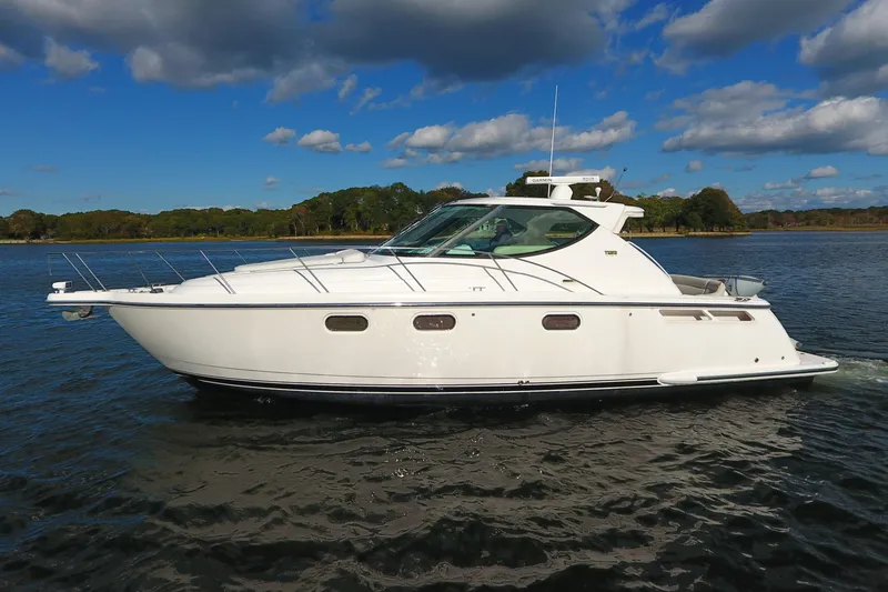 (1) 65' Dockside Power Cord: 120V AC 50 Amp with Glendinning® Cable Recoiler and Adapter for 30 Amp Service, Located Port and Aft (1) Charles® Battery Charger: 80 Amp (2) Bank Battery System: 12V with Batteries and Battery Switches (3 Engine Batteries and 4 House Batteries) (2) Carbon Monoxide Detectors (2) Smoke Detectors (3) Bilge Pumps: Automatic/Manual with Monitors at the Helm, 2000 GPH Each (1 Forward, 1 Mid and 1 Aft) (3) High Output Alternators: 115 Amp with Internal Regulators (4) Fire Extinguishers: Handheld (6) Tiara Life Vests (8) Black Dock Lines: 5/8" x 30' Antennas: TV and AM/FM Battery Parallel System CE Certification: Available for European Union Countries Cable TV & Phone Inlets: and Outlets with 65' Dockside Power Cord, Located Port Aft Composite Fuel Tank: Total Capacity 300 Gallons with In-Line Fuel Vent Filters Diesel Generator: Onana® 9kw MDKBL with Sound Shield and Helm Indicator Dockside Water Inlet: Aft Dual Air Horn Electrical Bonding System Engine Room Acoustical Insulation: with Overhead Fiberglass Liner and 12V Fluorescent Lighting Fire Extinguisher System: FE-241 Agent in Engine Room (HFC-227 Agent for CE) Fresh Water Pressure System: with Shurflo® Variable Speed Pump Fresh Water Tank: 102 Gallons Fresh Water Tank: Holding Tank Monitor Holding Tank: 38 Gallons with Desk Discharge and Holding Tank Vent Filter Joystick Control: Volvo® IPS NMMA Yacht Certification Navigator Compass: Ritchie® 4 1/2" Stainless Steel 2000 Oil Changing System: Main Engines and Generator Racor® Fuel Filters/Water Separators: for Engines and Generator Raw Water Intake Strainers: on Engines Service Pump Forward: 500 GPH Tiara Custom AC Electrical System: 12V DC and 120V/240V with DC Master Distribution Panel in the Cockpit U.S.C.G.: and International Lighting Vibration Mounts: Engines and Generator Volvo® Digital Engine Monitoring System: (Single Display) Includes Fuel Level and Rudder Angle Indicators. Engine and House Battery Voltages Included in Engine Display Volvo® Electronic Engine Controls: and Steering System with 17.5" Mahogany Wheel Water Heater: 11 Gallons Zincs: Transom, Trim Tabs and Drive Units