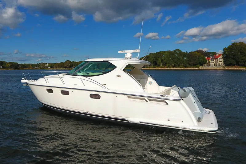 (1) Foredeck Cleat: 10" (2) Cleats: 10" for Spring Lines (2) Forward Deck Hatches: Cast Aluminum and Acrylic with Adjusters and Built-In Ocean Air® Screens and Privacy Covers (4) Cleats: 12" for Bow and Stern Lines (5) Recessed Opening Portlights: Stainless Steel, Molded-In, with Privacy Inserts 5-Year Limited Warranty: Transferable, on Hull and Deck Anchor Rope Locker: Flush Forward with Overboard Drain Anchor Windlass System: Automatic Rope/Chain with Operation from Foredeck Foot Pedal and Remote Switch at Helm Awlgrip® Awlstar: Anti-Fouling Black Bottom Paint Balsa Cored Deck: and Hullsides Black Imron® Bootline: with Gold Accent Bow Rail: One-Piece Welded 316L Stainless Steel with Pulpit, Staff and Tiara Burgee Bronze Seacocks: on all Underwater Thru-Hull Fittings Centerline Entry: to Salon with Acrylic Sliding Companionway Door, Screen Door and Privacy Cover Clarion AM/FM/CD Stereo System: with Remote Amp Subwoofer (4) Speakers (2 in Hardtop and 2 in Aft Cockpit) Clarion® iPod® Interface Construction: with a Gelcoat Outer Layer with Fiberglass Skinned and Infused with AME® 6000 Premium Vinylester Resin Using Closed Mold Technology Curved Companion Lounge: with Table and Cup Holders Fiberglass Pulpit: Molded-In with Stainless Steel Roller Helm Console: and Seat Covers for All Cockpit Furniture Helm Seat: Electrically Actuated Fore and Aft with Storage Below Hull & Deck: Fresh White Gelcoat Hullside Engine Room Ventilation: Molded-In Portside Navigation Center: Including Chart Storage with White Acrylic Lid and Cup Holders Tiara Custom Composite Hardtop: Integrated with the Windshield. Includes Solid Side Glass Enclosures Aft Curtain (1) Hatch with Built-In Ocean Air® Screens and Privacy Covers Red and White LED Lighting Aft Curtain Includes a Zippered Entryway Tiara Custom Composite Windshield: Integrated Into the Standard Hardtop with Tempered Safety Glass Safety Handrails Power Opening Center Section (3) Washer/Wipers Tiara Custom Diamond Pattern: Non-Skid Deck and Cockpit Surfaces Tiara Hinged Helm Console: with Digital Engine Monitoring Displays Recessed Cup Holder 12V Accessory Outlet Mahogany Steering Wheel Trim Tabs: QL Marine® Upper Cockpit Wet Bar: Including Sink with Cup Holders, Refrigerator and 120V Outlet Wood & Foam Core Stringers: Enclosed with Fiberglass and Integrated to the Hull