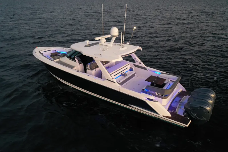 The third model in the LS series, the 43 LS, combines the aesthetic of sport styling with the luxurious amenities and details synonymous with the tiara brand. Guests can choose from multiple social zones for relaxation and leisure. forward, the bow features wrap around seating with a reclining lounge. The helm seats four comfortably, with standing room and a leaning bolster just aft, providing a secure zone for more guests while underway. A side boarding door located portside presents access to your favorite water activities. The innovative aft u-lounge rotates 180 allowing guests to further enjoy the swim platform and beautiful views. entertain everyone aboard from the galley, well equipped with sink, refrigerator and large countertop. Below deck, comfortable accommodations for four await.