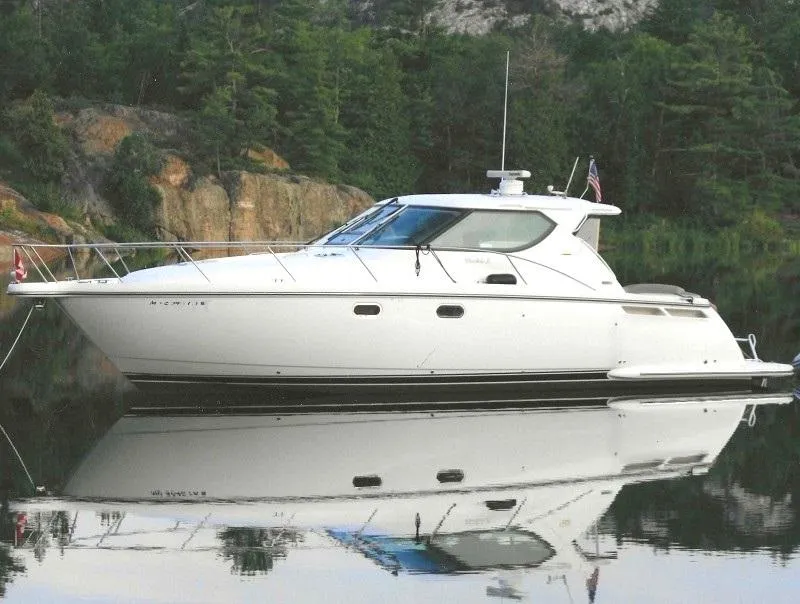 The Tiara 4300 Sovran was a game-changer in the boating industry, the first American boat to be designed exclusively for Volvo's revolutionary IPS Pod drive system. Pod drives don't just outperform conventional inboard power; they also require less engineroom space. In the 4300 Sovran, Tiara engineers were able to use this extra space by extending the midcabin bulkhead aft, beneath the bridge deck to create a full-size guest cabin complete with its own head. The Sovran's luxurious interior, an appealing blend of high-gloss cherry cabinets, Ultraleather upholstery and hardwood flooring, features an open salon with convertible settee to starboard and full-service galley to port. The forward stateroom has a queen island berth and flat screen TV. The Sovan's open cockpit features forward and rear facing lounge seating with a centerline table. A transom door leads to an extended swim platform with fleshwater shower. The hardtop is fully integrated into the windshield. The optional Volvo D6 435D IPS diesels will cruise in the high 20s. The 4300 Sovran is one of Tiara's top sellers, and MEANT TO BE is absolutely immaculate! Don't miss this one!!