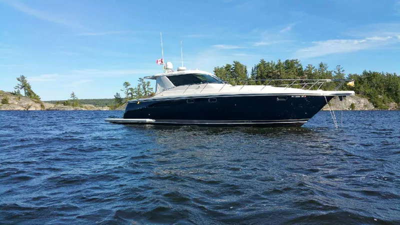 44/47 Tiara. This is the ultimate cruising big boat for the entire family. Many custom extras added to this boat to make it one of a kind. Climate control helm along with four TVs located throughout the boat. The beautifully crafted, custom-curved composite windshield is seamlessly integrated with the hardtop of the 4400. Intuitive design plus time-tested placement of gauges, throttles, and controls, ensure that being behind the helm is akin to a ride on cloud nine. The aft of the 4400 offers a standard swim platform, extending the 4400 by an extra 52 inches. Rear storage space is built-in and accessed through a hydraulically actuated fiberglass hatch. Belowdecks, the 4400 features plush leather seating, Corian countertops, stainless steel sink, abundant storage, and a built-in 22-inch flat screen TV with DVD technology. The lounge features a folding birds eye maple / teak table which converts to berth, increasing sleeping accommodations to six. The master stateroom boasts a queen-size pedestal bed, with spring mattress, and storage below. The second stateroom also has it's own access to the head.