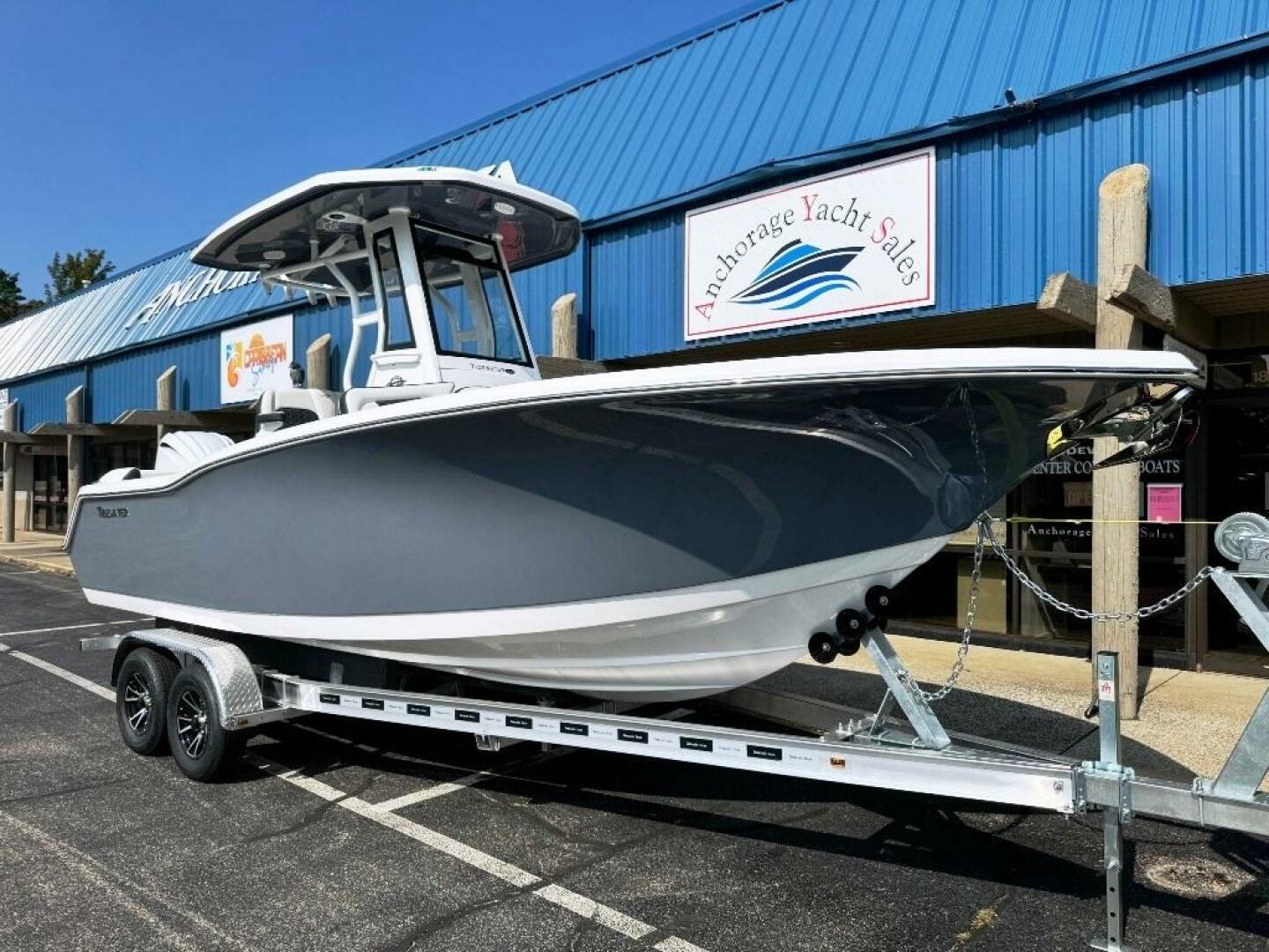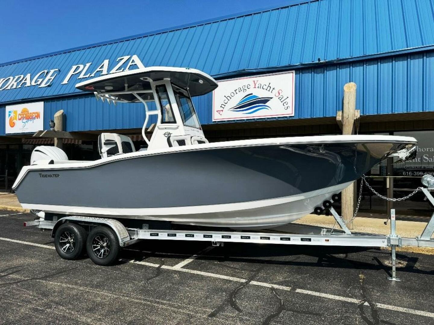 This Brand-New Tidewater 232 SS features the Oyster hull side color and has the matching Oyster under the Hard Top and on the console face plate. What a Beauty!! She is powered by an Optional Yamaha F-300xcb Custom painted White. This boat has a ton of options including, Seakeeper Ride System! Power Assist Steering, Full glass windshield with power vent, Deluxe drop bolster helm seat with armrest, White Interior, Soft Grip Floor Throughout, Windlass, JL Stereo w/6 speakers, Underwater lights, Raw water washdown, LED Cockpit lighting, Garmin 1243xsv, Yamaha CL5 Display, Fender cleats, Dual batteries, Porta Potti and more! This boats Includes an Upgraded 2 axle Commander Trailer. If you haven't been for a ride on one of these....you really should! Besides their Aggressive Offshore looks, the 232 SS is Fast, Dry and Comfortable with more seating than other boats in her class and size and most importantly....they are FUN to drive and Easy to take care of! Give us a call or an email for all the details!