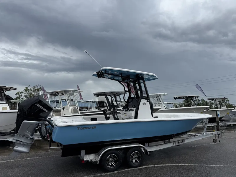BRAND NEW 2026 2410 TIDEWATER WITH A MERCURY 300 VERADO 4 STROKE HYD. JACKPLATE GARMIN 12 WITH THRU HULL TRANSDUCER STEREO SYSTEM UPGRADE HELM PAD WITH TW LOGO RAW WATER WASH DOWN GLASS ENCLOSURE T TOP TRIM TABS TROLLING MOTOR PRE WIRE