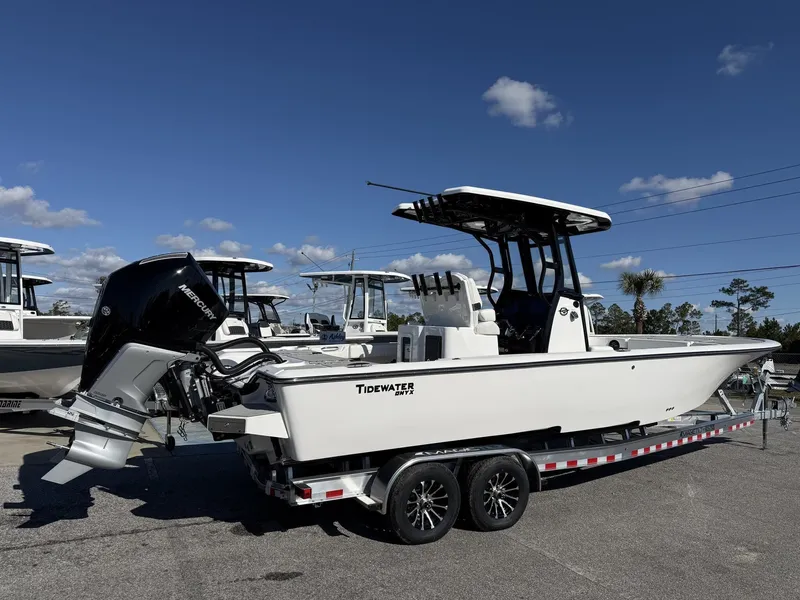 THIS IS ONE BAD BOAT ! 2026 TIDEWATER 2700 CAROLONA BAY WITH TWIN MERCURY 300 VERADOS ONXY BLACK OUT PKG FULL TIDEWATER MATT FLOORING TWIN GARMIN 1243S WITH THRU HULL TRANSDUCER FRESH WATER SHOWER UPGRADED STEREO SEABLAZE UNDER WATER LIGHTS BOBS HYD JACKPLATE