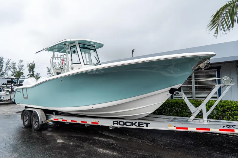 Outfitted with a dual Simrad NSS16 EVO3S electronics package, JL Audio system with 10" subwoofer and amp, Gemlux outriggers, and Lumitec RGBW underwater lights, this 292CC is turnkey and ready to fish or cruise. The grey and black teak Dekit flooring, painted white Mercury engines, and two-tone hull complete the boat's high-end aesthetic.
