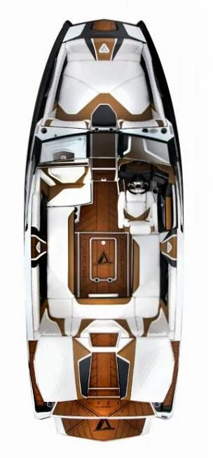 At the transom, the wide sun pad provides a relaxing spot between sets, leading to a full-width swim platform that makes water access easy and social, rounding out a layout built for effortless days on the water.