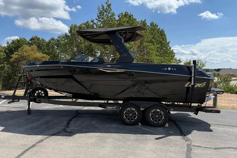 The All New 2026 Tige Z3 Specifications: Powered by an Indmar Raptor 440 Weight: 6,500 lbs Ballast: 4,300 lbs The GO System powered by TAPS 3T E4 Powered Tower with SolidShade Bimini Convex V Hull Surf Locker Rear Camera Audison sound system with sub RGB Lighting Smart Wheel Boat Cover Trailer included