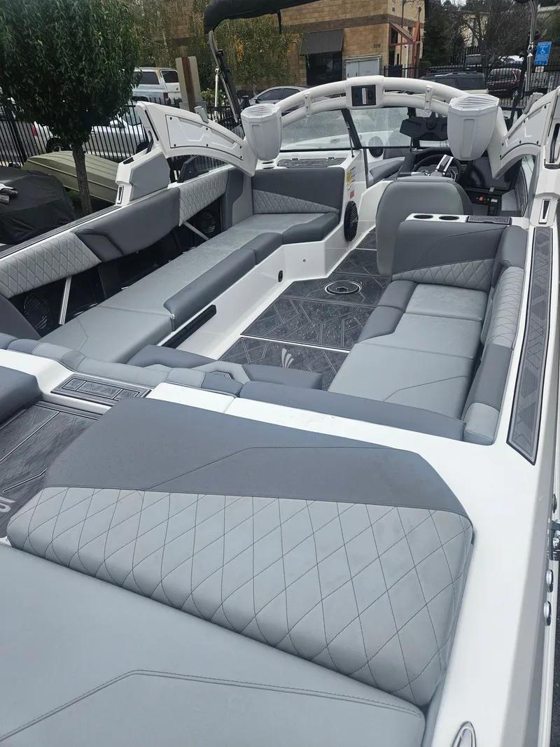 The wraparound lounge seating is deep, plush, and flexible - with convertible backrests, armrests, and ample storage beneath every cushion. The interior features multi-zone Wet Sounds audio with a subwoofer and tower speakers, ensuring your soundtrack matches your performance.