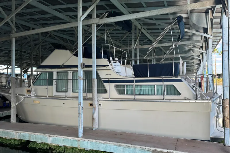 A LOT OF BOAT FOR THE MONEY! - Tw. Crusader 270 hp. direct drive inboard engines & a 6.5 kw Onan Generator. You enter the salon via a side door by the lower helm. To starboard & down two steps is the entrance to the private head & shower + guest cabin with a vee berth in the forepeak. In the salon is an L-shaped seating area, the lower helm & the galley. Aft of the salon is the master stateroom with a double bed to port & storage on the starboard side, plus a private head & shower. The interior cabinetry is teak with pale blue upholstery.