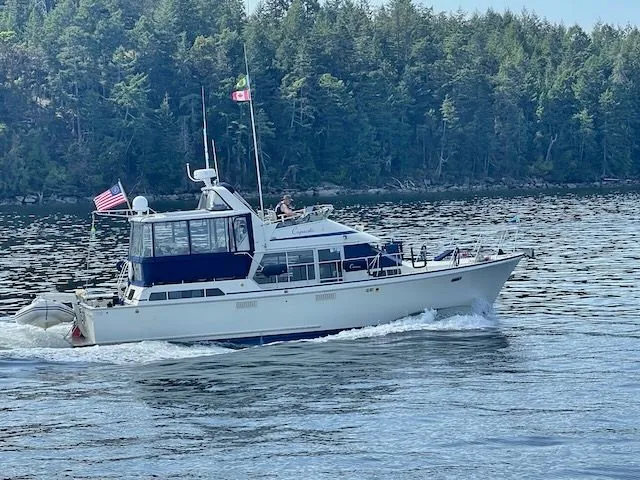 This 1988 model has been professionally maintained and is powered by twin Caterpillar 3208TA diesels (375 hp each). She cruises comfortably at 9 knots while burning just 3-4 gallons per hour, offering excellent range and economy. With updated systems, thoughtful upgrades, and assumable moorage in desirable La Conner, WA, this yacht is turnkey and ready for extended cruising or fishing.