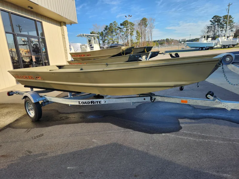 The NEW TRACKER GRIZZLY 15 Jon is a rugged and versatile aluminum jon boat, suitable for fishing, hunting, or work purposes. Its unitized stringer, transom, and hull ensure a sturdy build and a smooth, dry ride. The boat features a thick .063 aluminum cockpit floor and a 9.5-gallon wet well on the front deck. The 7° deadrise Mod V hull provides a comfortable ride, and the Forest Green powder-coat finish, along with the SURE TREAD texture on the floor, adds to its durability. Additionally, the TRACKER PROMISE warranty offers peace of mind, making it a reliable choice among aluminum boats.