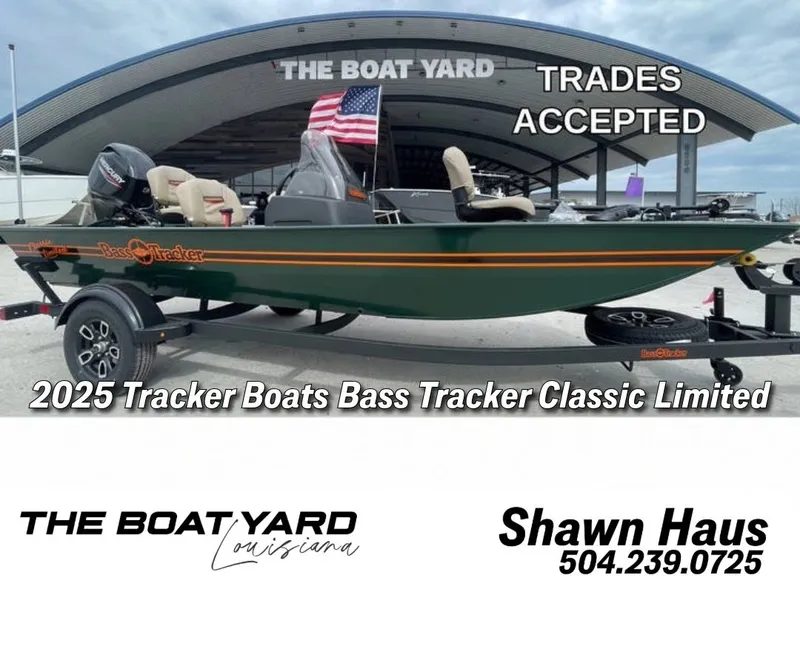 Call Tyler 407-913-8078The 2025 Tracker Bass Tracker Classic Limited is a premium fishing boat designed to elevate your angling experience while embodying classic style and modern functionality.Key FeaturesDimensions and CapacityLength: 16 ft 8 in (5.08 m)Beam: 6 ft 5 in (1.96 m)Max Recommended HP: 50 HPMax Person Capacity: 3 personsMax Weight Capacity: 1,025 lbs (464.93 kg)Durable ConstructionBuilt with a rugged all-welded .100-gauge aluminum hull, the Classic Limited features a DIAMONDCOAT powdercoat finish in Army Green, ensuring both durability and an eye-catching appearance.The boat includes a pressure-treated floor and decks with a limited lifetime warranty, providing long-lasting reliability.Upgraded Fishing FeaturesEquipped with a Lowrance Hook5 Reveal color GPS fishfinder for enhanced navigation and fish tracking.Two pedestal seat bases and two folding fishing seats with contoured hinges ensure comfort during long days on the water.Elevated bow and aft casting decks provide ample storage space below, optimizing your fishing setup.Convenience and ComfortThe interior is lined with marine-grade carpet that is water-resistant and designed for quick drying, preventing mold and mildew.Additional features include an integrated livewell system, multiple rod holders, and ample storage compartments to keep your gear organized.PerformancePowered by a Mercury FourStroke engine, the Classic Limited offers smooth, quiet operation with fuel efficiency, allowing for fast runs to your favorite fishing spots.Trailer IncludedComes with a custom-fit single-axle trailer featuring GALVASHIELD Impact corrosion protection, making transportation easy and secure.