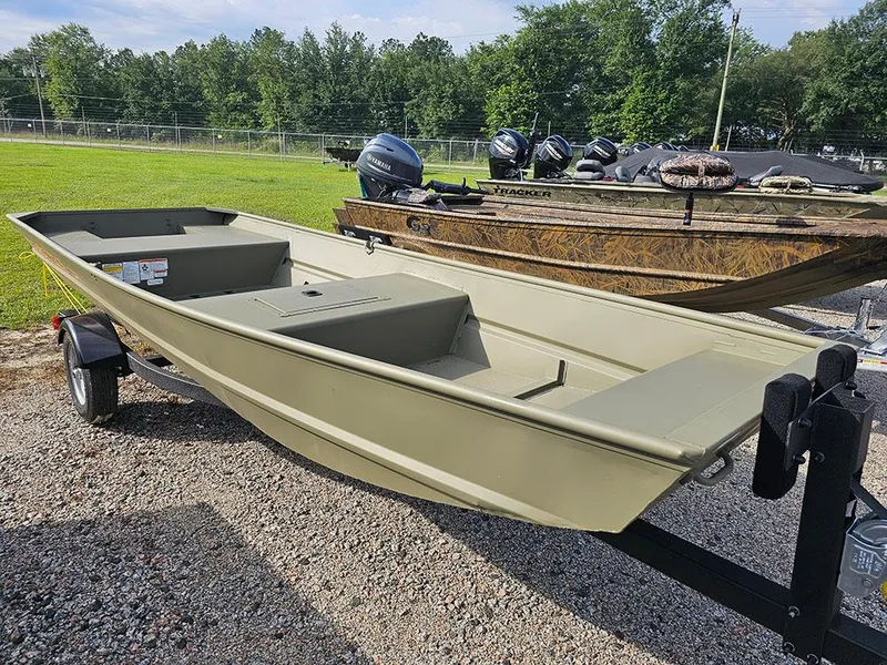 The NEW TRACKER GRIZZLY 15 Jon is a rugged and versatile aluminum jon boat, suitable for fishing, hunting, or work purposes. Its unitized stringer, transom, and hull ensure a sturdy build and a smooth, dry ride. The boat features a thick .063 aluminum cockpit floor and a 9.5-gallon wet well on the front deck. The 7° deadrise Mod V hull provides a comfortable ride, and the Forest Green powder-coat finish, along with the SURE TREAD texture on the floor, adds to its durability. Additionally, the TRACKER PROMISE warranty offers peace of mind, making it a reliable choice among aluminum boats.