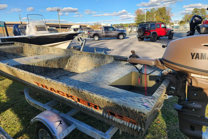 The NEW TRACKER GRIZZLY 15 Jon is a rugged and versatile all-welded aluminum jon boat, suitable for fishing, hunting, or work purposes. Its unitized stringer, transom, and hull ensure a sturdy build and a smooth, dry ride. The boat features a thick .063 aluminum cockpit floor and a 9.5-gallon wet well on the front deck. This hull provides a comfortable ride, and the Forest Green powder-coat finish adds to its durability. Additionally, the TRACKER PROMISE warranty offers peace of mind, making it a reliable choice among aluminum boats.