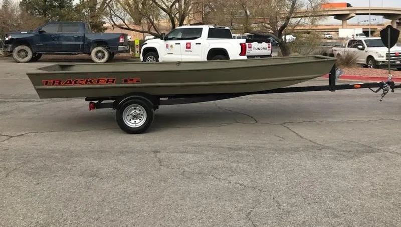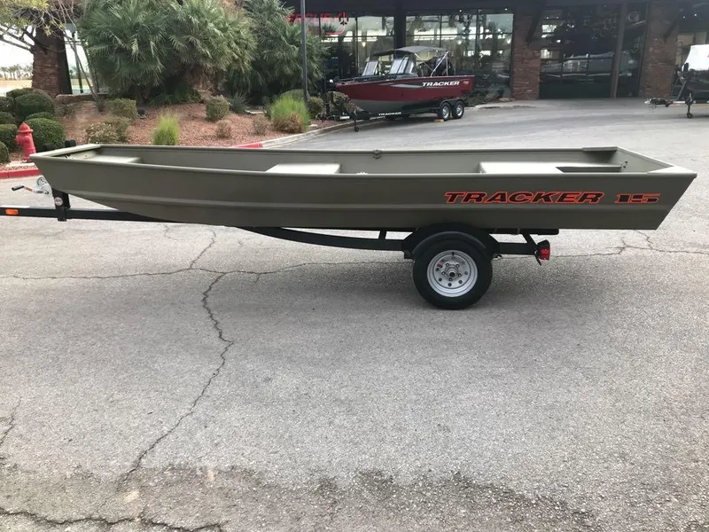 The NEW TRACKER GRIZZLY 1542 Jon is a rugged and versatile aluminum jon boat, suitable for fishing, hunting, or work purposes. Its unitized stringer, transom, and hull ensure a sturdy build and a smooth, dry ride. The boat features a thick .063 aluminum cockpit floor and a 9.5-gallon wet well on the front deck. The 7° deadrise Mod V hull provides a comfortable ride, and the Forest Green powder-coat finish, along with the SURE TREAD texture on the floor, adds to its durability. Additionally, the TRACKER PROMISE warranty offers peace of mind, making it a reliable choice among aluminum boats.