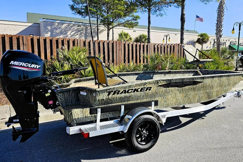 From rivers and bayous to lakes and brakes, the TRACKER 1650 T Prairie Wings Edition is custom-made to get you, your gear, and your buddies to those out-of-the-way honey holes that guarantee you'll get your limit. A no-frills interior provides all the space you need to haul spreads, dog's and your best friend while smooth, reliable, and stealthy Mercury® FourStroke power with an Icebreaker keel gets you there. The cockpit and decks are coated with Sure Tread™ flooring that offers superior grip in any conditions. Bow and stern pedestal seating locations offer versatility while hunting or when underway, and easy-to-reach switching offer simple, reliable control over the boat's functions. Outwardly, the TRACKER 1650 T Prairie Wings edition is covered in your choice of flat green or True Timber® camo finishes, and like all TRACKER boats, it's made with 100% all-welded aluminum for maximum durability. Rear steps add an additional layer of convenience and safety, and VERSATRAK™ mounting channels let you add all manner of accessories for a truly customized killer tiller.